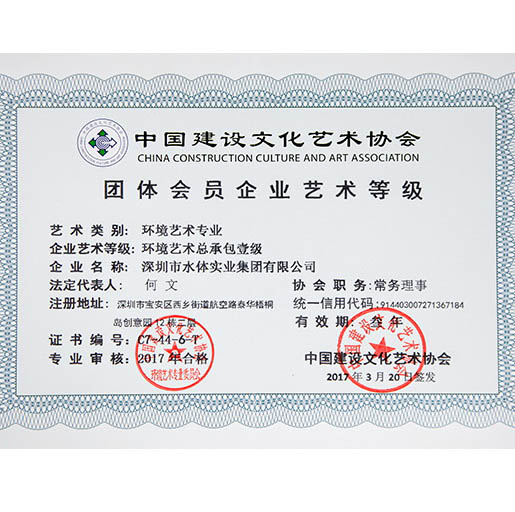 水體集團是噴泉界的先驅(qū),是中國華南地區(qū)具實力的噴泉水景專業(yè)公司,是中國噴泉水景委員會副主任單位、中國環(huán)境藝術(shù)委員會常務(wù)理事單位、深圳市《政務(wù)、商務(wù)決策專家咨詢支持系統(tǒng)》定點服務(wù)單位,具備噴泉水景、水處理、景觀噴灌、噴霧加濕、設(shè)計、施工專業(yè)等級,環(huán)境藝術(shù)企業(yè)藝術(shù)等級總承包類、工程類一級、設(shè)計類甲級,城市及道路照明工程專業(yè)承包三級,等等資質(zhì)。